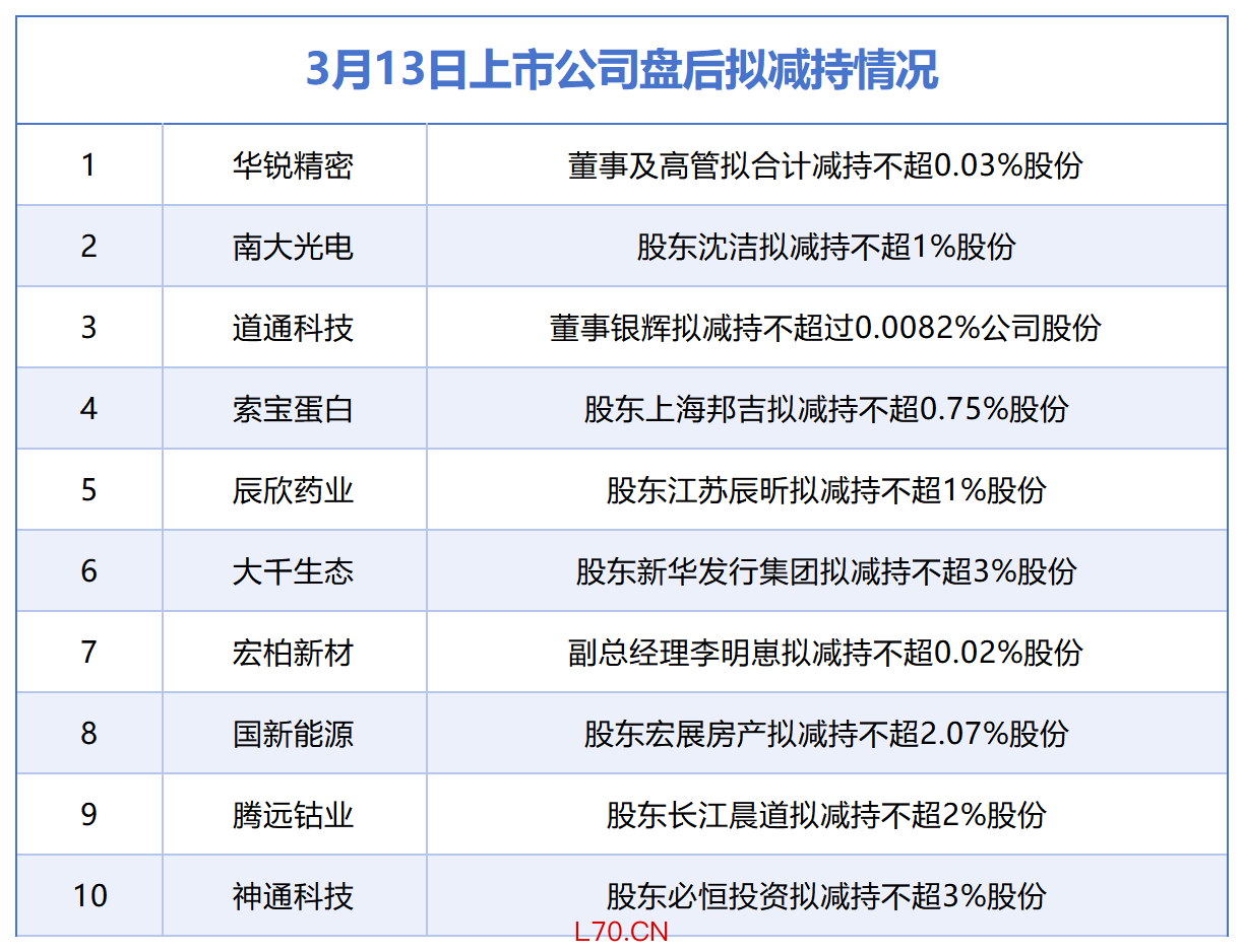 3月13日增减持汇总:中国东航增持,华锐精密等10股拟减持(表)