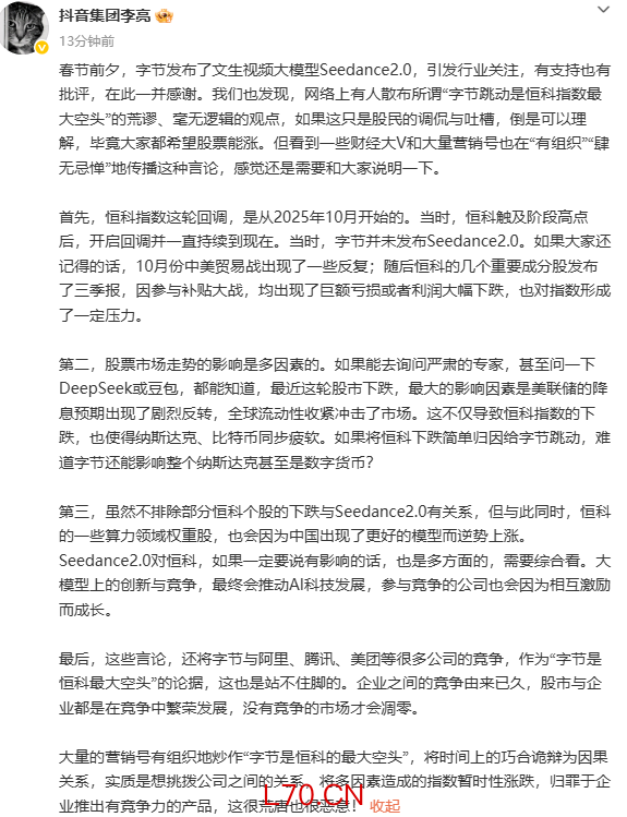 抖音集团李亮:炒作“字节是恒科的最大空头”很荒唐也很恶意