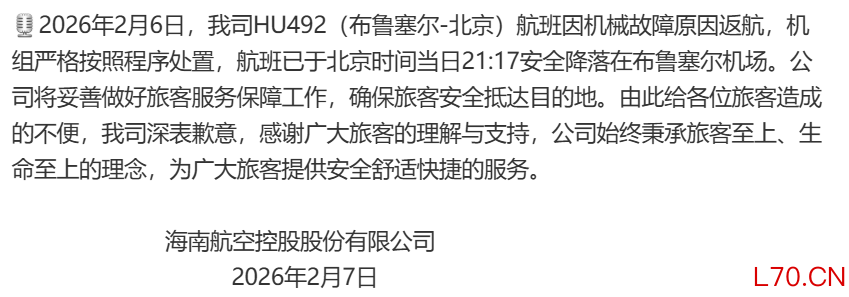 海航就HU492航班因机械故障原因返航致歉