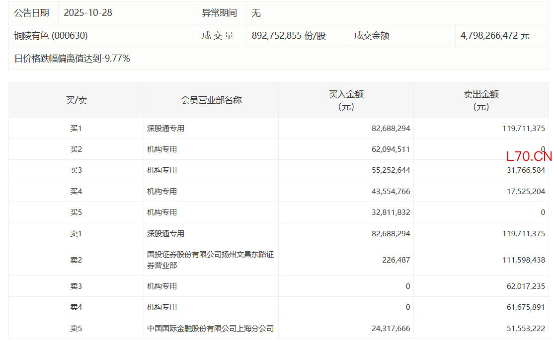 铜陵有色今日跌停,4家机构专用席位净买入1.44亿元