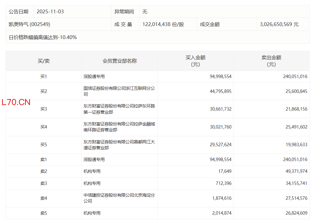 凯美特气今日跌9.96%,有3家机构专用席位净卖出1.08亿元