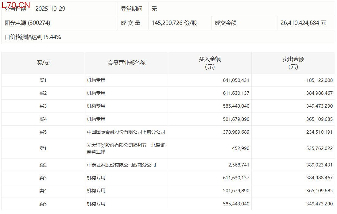阳光电源今日涨15.44%,4家机构专用席位净买入10.55亿元