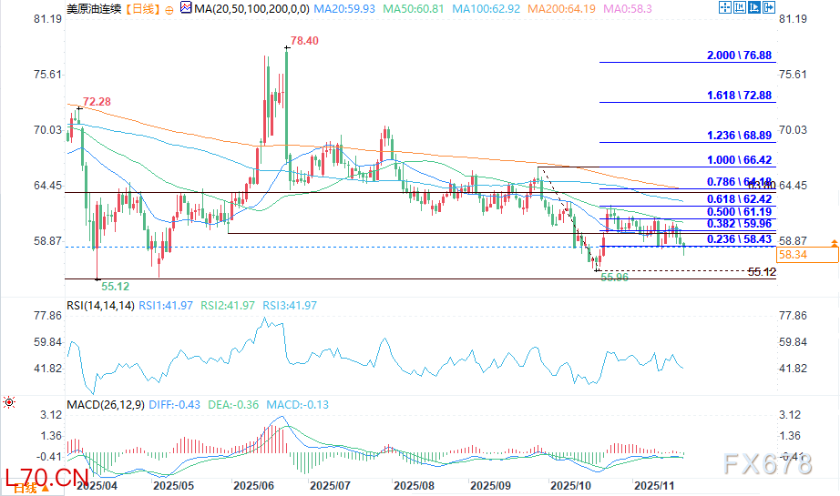 汇通财经APP讯——周五(11月21日)欧洲时段,看空情绪主导市场,注意力转向下一主要下行目标:10月20日形成的55.96美元主要底部,以及5月5日的55.30美元主要底部。