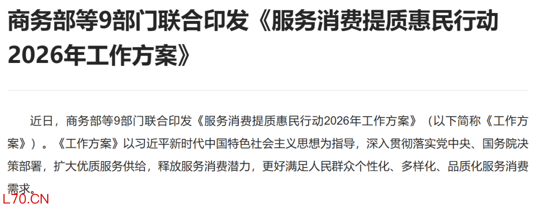 商务部等9部门联合印发《服务消费提质惠民行动2026年工作方案》(以下简称《工作方案》)。《工作方案》以习近平新时代中国特色社会主义思想为指导,深入贯彻落实党中央、国务院决策部署,扩大优质服务供给,释放服务消费潜力,更好满足人民群众个性化、多样化、品质化服务消费需求。