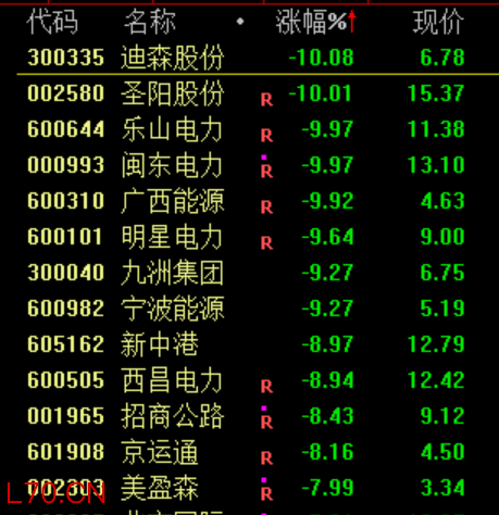下跌方面,电力股集体调整,乐山电力、闽东电力等跌停。