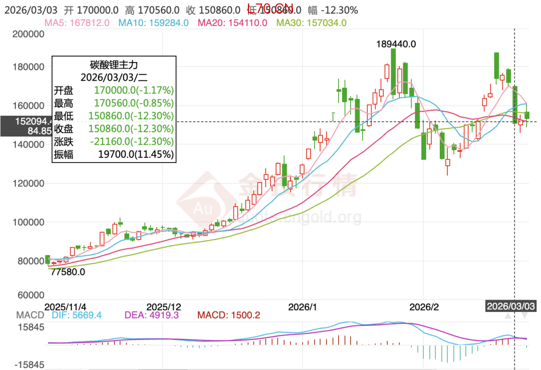 次日,碳酸锂期货主力合约触及跌停,跌幅12.3%,收盘报150860元/吨。受此影响,锂矿股全线大幅下挫,赣锋锂业H股(01772)当日跌幅超10%,天齐锂业H股(09696)跌逾8%。