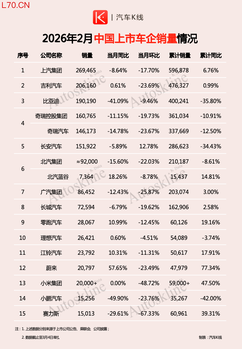 海通国际在最新研报中指出,2月车企销量在春节扰动与消费节奏切换下普遍承压,但结构分化已现,部分企业依靠海外放量、主力车型支撑表现稳健。
