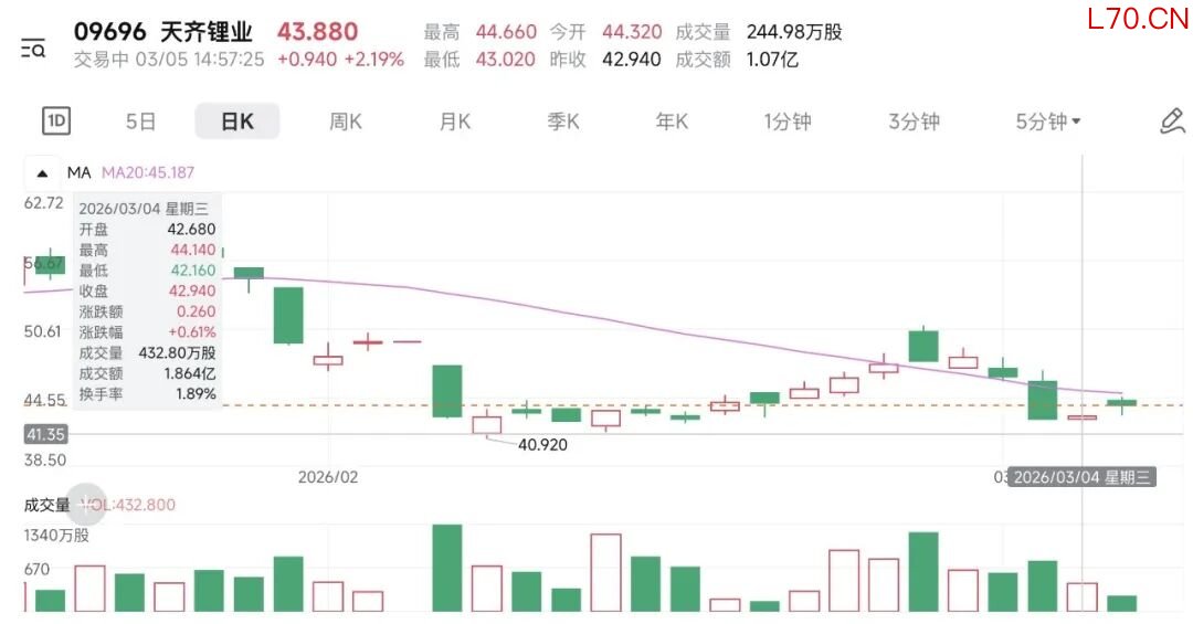 天齐锂业A股(002466)表现更为亮眼,3月4日录得近1%上涨,成为当日少数录得上涨的A股汽车股。