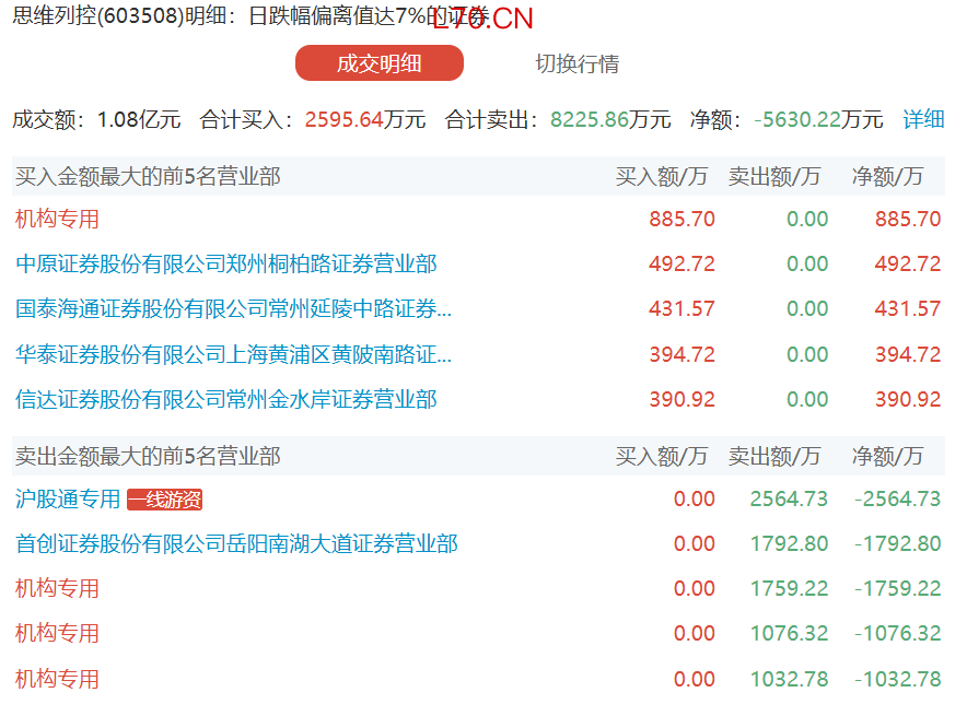 思维列控今日跌9.87%,有4家机构专用席位净卖出1.25亿元