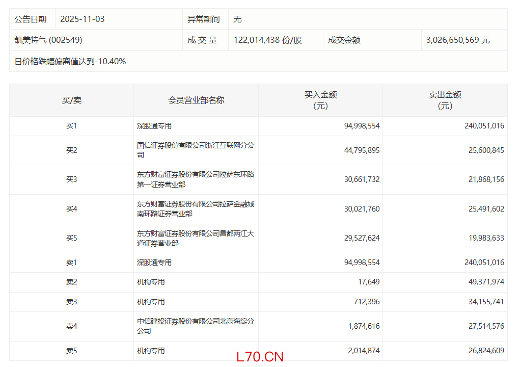 凯美特气今日跌9.96%,有3家机构专用席位净卖出1.08亿元