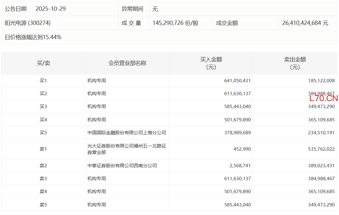 阳光电源今日涨15.44%,4家机构专用席位净买入10.55亿元