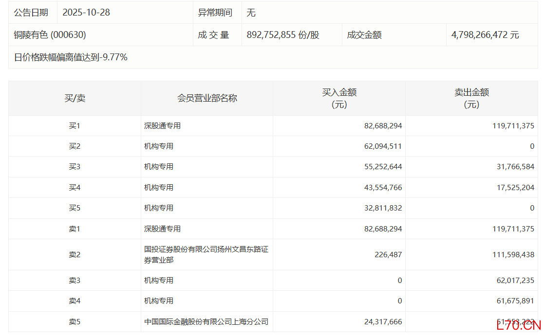 铜陵有色今日跌停,4家机构专用席位净买入1.44亿元