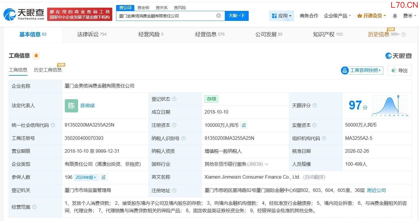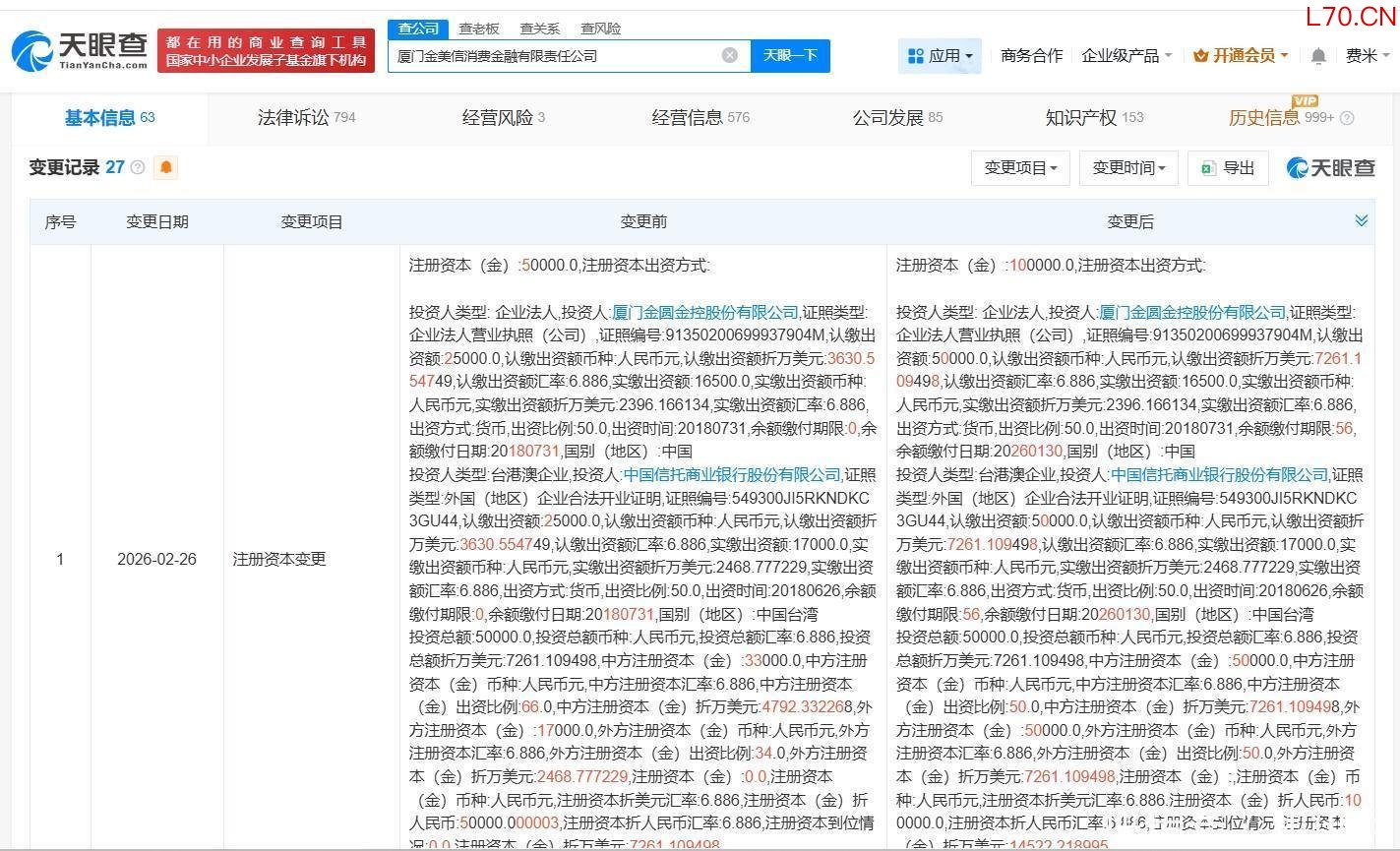 厦门金美信消费金融公司增资至10亿 增幅100%