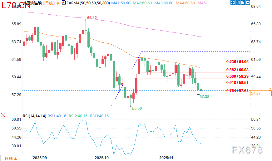 汇通财经APP讯——周一(11月24日)欧盘时段,WTI原油持续承压,卖方推动价格连续第四个交易日刷新低点。交易商密切关注上周五57.38美元的低点——在本周交易时间缩短的背景下,若该支撑位失守,可能引发更大幅度下跌,使10月20日创下的55.96美元主要底部价位再度成为市场焦点。目前市场仍显沉重,买方在价格走弱时未表现出明显兴趣。