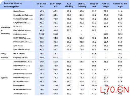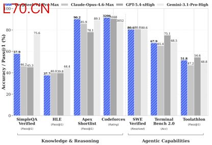 据DeepSeek披露的基准测试数据,在知识与推理类测试中,DeepSeek-V4-Pro-Max在Apex Shortlist和Codeforces两项测试中取得了最优性能,超越Claude-Opus-4.6-Max、GPT-5.4-xHigh、Gemin-3.1-Pro-Hight等国际模型,展现了极强的逻辑与算法能力;在SimpleQA Verified测试中较Gemini-3.1-Pro-High略有差距但领先于Claude和GPT。